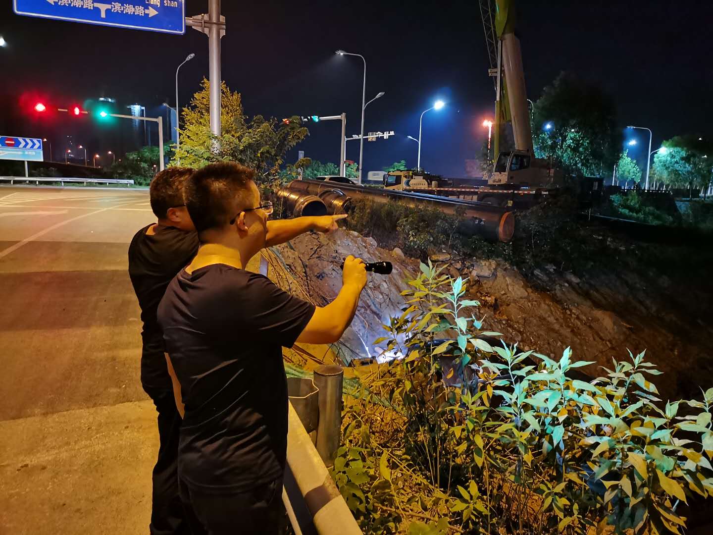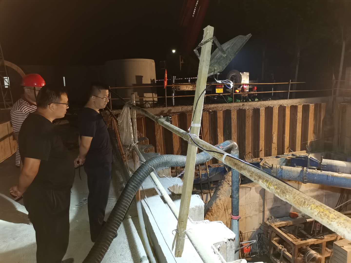 鄧剛先后視察了管網(wǎng)施工第六標(biāo)段、頂管過(guò)地表水超采、頂管過(guò)火頭灣大橋、頂管過(guò)S321公路等5處頂管施工現(xiàn)場(chǎng)。時(shí)至23:40分,在頂管過(guò)南躍進(jìn)溝工作井施工現(xiàn)場(chǎng),數(shù)名施工人員挑燈夜戰(zhàn),正進(jìn)行頂管軌道焊接安裝和設(shè)備調(diào)試工作,夜燈下的身影在工地上來(lái)往奔波,現(xiàn)場(chǎng)到處是搶抓工期的干勁與熱情。