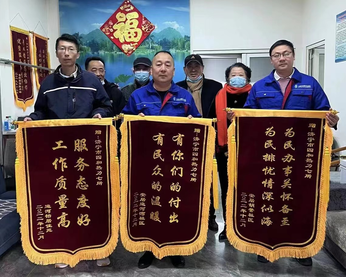12月8日,胡營(yíng)回遷一期、胡營(yíng)回遷二期運(yùn)河灣、胡營(yíng)運(yùn)河怡居佳苑三個(gè)小區(qū)的業(yè)委會(huì)代表以及胡營(yíng)回遷一期唐營(yíng)黨支部領(lǐng)導(dǎo)專程前往濟(jì)寧四和供熱有限公司供熱服務(wù)七所,將四面鮮紅的錦旗送到所長(zhǎng)劉延春手中,感謝始終奮戰(zhàn)在供熱一線的工作人員的辛勤付出。